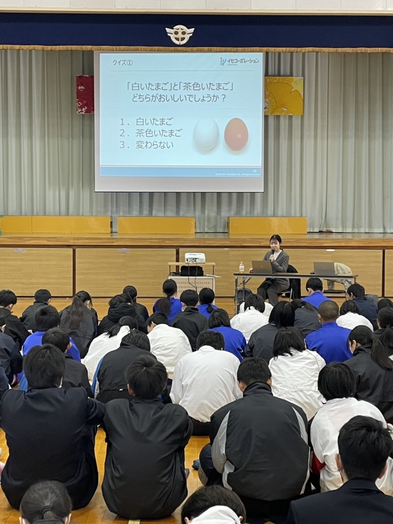 2026.01.09 たまごに関する講演会 食育活動として、つくばみらい市立伊奈中学校でたまごに関する講演会を実施しました。 養鶏場の様子を動画で説明し、にわとりから産まれたたまごがどのようにして出荷されていくのか学んでいただきました。 また、たまごの栄養や適切な保存方法などについても学んでいただきました。日々の生活に少しでもお役に立てればうれしいです。 にわとりやたまごに興味を持っていただく貴重な機会をいただきありがとうございました。今後も食育活動を行っていきたいと思います。