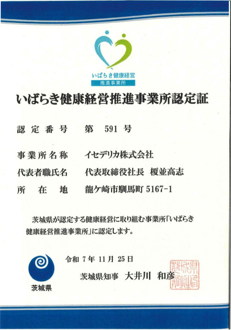 2025.12.16 「いばらき健康経営推進事業所」に認定されました このたび、当社は茨城県が推進する「いばらき健康経営推進事業所」に認定されました。当社では、従業員一人ひとりが心身ともに健康で働ける環境づくりを目指し、健康診断の受診促進、食生活改善の支援、メンタルヘルス対策など、さまざまな取り組みを行っています。今後も「健康経営」を重要な経営課題と位置づけ、従業員の健康と企業の持続的成長を両立させるため、さらなる取り組みを進めてまいります。